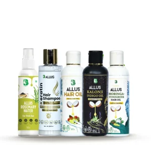 Allu’s Hair Oil 100ml + Allu’s Kalonji Indigo Oil 100ml + Allu’s Moringa Fenugreek Hair Oil 100ml + Allu’s Rosemary Water 200ml + Allu’s Keratin Shampoo 200ml